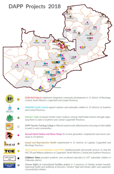 Partner DAPP Sambia "DAPP" steht für Development Aid from People to People - zu deutsch Entwicklungshilfe von Volk zu Volk. DAPP Sambia ist registriert als "Welfare Society under the Societies' Act of Zambia". Die Aktivitäten begannen 1986, die Registrierung als Zambische Wohltätigkeitsorganisation erfolgte 1990. Der Verein ist Mitglied der Föderation HUMANA People to People. Der Sitz des Vereins ist in Ndola. Eckdaten 2018: Mit 950 Beschäftigten und 18.321 Freiwilligen betrieb DAPP 156 Projekteinheiten in 30 Distrikten in 9 Provinzen und erreichte damit 1,3 Millionen Menschen in den Entwicklungs- projekten. Zusätzlich dienten 33 Second Hand Shops etwa 1,5 Millionen Menschen. Einen Überblick über alle Projekte im Jahr entnehmen Sie bitte der Karte unten. Unser deutscher Verein hat seit 2005 die Arbeit mit gefährdeten Kindern unterstützt, und zwar im Kinderdorf Malambanyama in der Zentralen Provinz und in Projekten in der Südlichen Provinz. Stand der Infos: aus dem Jahresbericht 2018, DAPP Zambia. ![]() |
